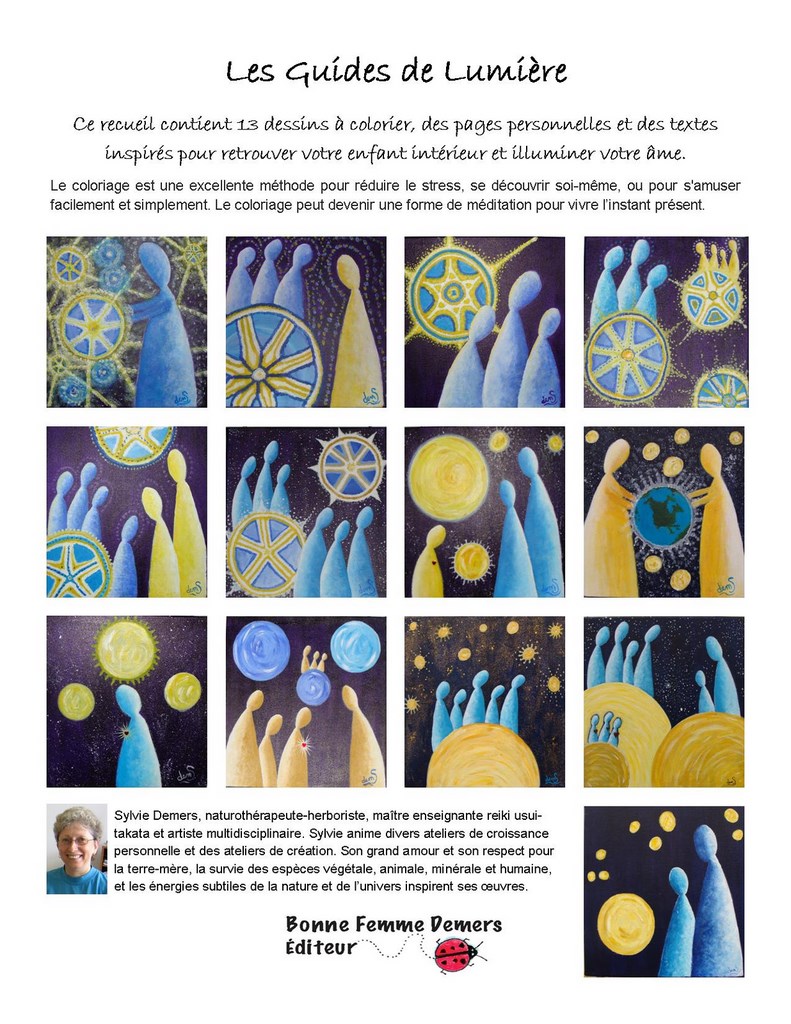 Croquis originaux qui ont servi à la réalisation des œuvres signées Sylvie Demers (demS), que vous retrouvez en couleur sur le dos de couverture. Des images inspirées par mes Guides Spirituels de Lumière lors de méditations sur des aspects de la vie ou des événements. Ces petits dessins inspirés sont, pour eux, une façon de m’aider à opérer des guérisons personnelles. J’espère qu’il en sera de même pour vous pendant vos sessions de coloriage.